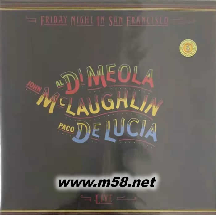 Friday Night in San Francisco(舊金山星期五之夜 三位吉它大師LIVE) 黑膠(m58.net) 三位不同國藉的吉他大師 (Al Di Meola/美國, John Mclaughlin/英國, Paco De Lucia/西班牙) 1980年某日星期五的夜晚在美國舊金山The Warfield Theatre吉他三重奏現場錄音.三位大師相互競飆手指的速度,散播佛朗明哥的熱情,激情與技巧盡現,令人大呼過癮.史上最佳吉他現場競技,三位大師合作默契絕佳的吉他演奏,真是可以用登峰造極來形容.