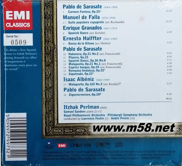 小提琴炫技集 VIRTUOSO VIOLIN LPCD45 II 限量版(m58.net) 這張唱片被企鵝指南評為三星帶花,也早已被公認為小提琴的經典名盤,其中收集了一組具有強烈西班牙色彩的小提琴精品,具有即興的特點和豐富的情緒色彩。小提琴中華麗多姿的技巧展露無遺,聽過之后毫不猶豫地出“過癮”二字。 帕爾曼的演奏準確靈巧,輕松自如,細膩而理性,音色變換無窮,他以演奏浪漫風格的曲目著稱,這些特點用于演繹西班牙風格的樂曲再適合不過了。 唱片中最早的錄音在1972年,多數在1980年,都處在錄音技術日臻完美的階段,音色柔美,背景干凈。 這張集錦是由EMI的頂極錄音師集體創作的,幾乎集中了EMI所有的精兵強將,錄音的地點---Abbey Road Studios, London,細心的發燒友一定不會陌生,其中的吉普賽人之歌錄于匹茲堡Heinz Hall,都是音響效果極為另人滿意的場所。