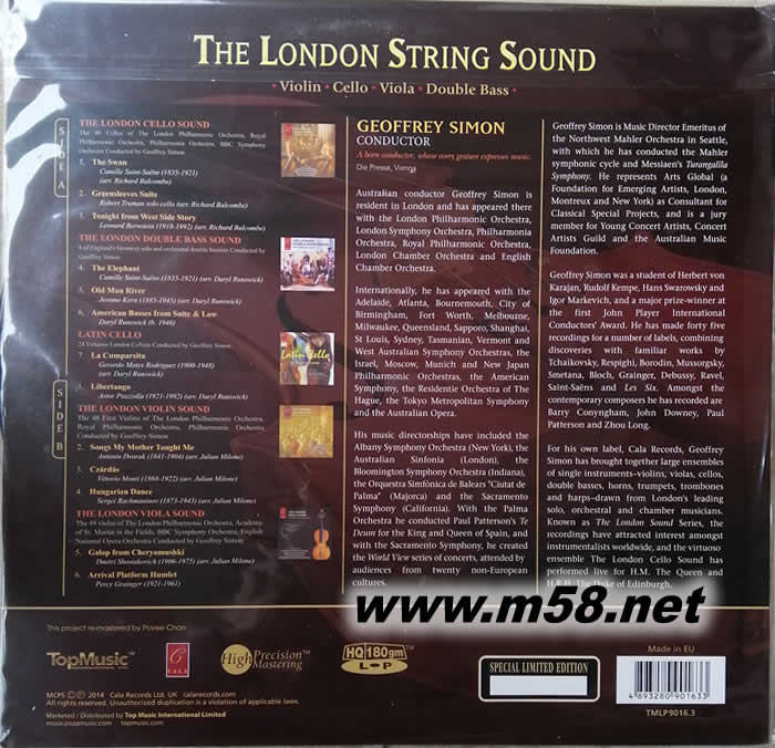 倫敦提琴之聲 180g 33RPM LP 黑膠(大中小提琴弦樂)(m58.net) Geoffrey Simon指揮 Hovland : The London String Sound 最美的弦樂盡在這一張「倫敦提琴經典」!從指揮家 Geoffrey Simon 邀集英國知名管弦樂團中最頂尖的弦樂演奏家所灌錄的五張精彩弦樂錄音中,精心挑選十三首動人心弦的經典曲目,弦樂迷人的松香味一次聽個夠! The Project Re-Mastered by Povee Chan SADiE Digital Precision Mastering Monitor Hi Fi System: Burmester Power System: Isoclean Power Conditioning System Mastered with Black Rhodium cables Manufactured in EU ★ 收錄大提琴名曲圣桑的《天鵝》、《綠袖子組曲》、「西城故事」中的《今夜.今夜》、探戈大師皮亞佐拉的經典名曲《自由探戈》、小提琴名曲《媽媽教我的歌》、低音大提琴演繹「動物狂歡節」中的《大象》等樂迷最喜愛的曲目。 ★ 發燒名廠 Top Music 特別取得 Cala 唱片公司的原始母帶,全程採用專利的高精密度母帶處理技術(High Precision Mastering)后期母帶處理,並採用最頂級的180克處女黑膠壓製,音質絕佳,珍藏首選!