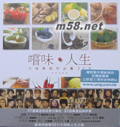 嘗味 人生 - 百味華語作品集(m58.net) 繽紛如調(diào)味架的歌曲 帶你重嘗當(dāng)天的酸甜苦辣 嘗味‧人生 - 百味華語作品集 2CD 27個華語樂壇實(shí)力單位 32首華語品味好歌 包括: 因?yàn)閻矍?陳奕迅+王菲/ 只是太愛你 張敬軒/ 脆弱 謝安琪/ 100種生活 盧廣仲/ A.I.N.Y. G.E.M./ 給我一個理由忘記 A-Lin/ 背叛 曹格/ 有沒有 韋禮安/ 壞人 方炯鑌/ 我愛他 丁噹/ 那些年 Robynn & Kendy 讓我們重嘗32口不同的人生之味