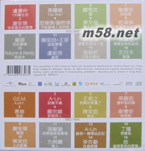 CD 1 01. 100種生活 - 盧廣仲 02. 沒有發(fā)生的愛情 - 謝安琪 03. You And I - 孫耀威 04. 不能跟情人說的話 - 范瑋琪/劉若英 05. 愛 - 鄭秀文 06. 情人知己 - 梁文音 07. 因?yàn)閻?- 韋禮安 08. 最重要的決定 - 范瑋琪 09. 好的事情 - 嚴(yán)爵 10. 那些年 - Robynn & Kendy 11. 因?yàn)閻矍?- 陳奕迅+王菲 12. 雀斑 - 盧凱彤 13. 愛情天使的一面 - 陳慧琳 14. 只是太愛你 - 張敬軒 15. 情歌沒有告訴你 - 梁靜茹 16. 倔強(qiáng) - 五月天 CD 2 01. A.I.N.Y. - G.E.M. 02. 背叛 - 曹格 03. 寂寞不痛 - A-Lin 04. 那個男人 - 楊宗緯 05. 我真的受傷了 - 王菀之 06. 淘汰 - 陳奕迅 07. 會呼吸的痛 - 梁靜茹 08. 有沒有 - 韋禮安 09. 脆弱 - 謝安琪 10. 心的距離 - 陳奕迅 11. 如果這就是愛情 - 張靚穎 12. 壞人 - 方炯鑌 13. 給我一個理由忘記 - A-Lin 14. 似曾相識 - 李克勤
