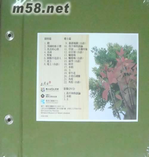親情篇 1.皆 2.異國的林子里 3.洗衣的收情 4.負荷 5.野餐 6.阿媽不是詩人 7.泥土 8.堤上(臺語) 鄉土篇 9.蕃諸地圖(臺語) 10.我不和你談論 11.序說-吾鄉印象 12.店仔頭(臺語) 13.麗殺場 14.麗殺場(臺語) 15.雨季(臺語) 16.稻草 17.水稻 18.土 19.牽牛花 20.去看白翎鷺 21.角度 22.角度(臺語) 影像DVD 1.我不和你談論 2.水稻 3.土