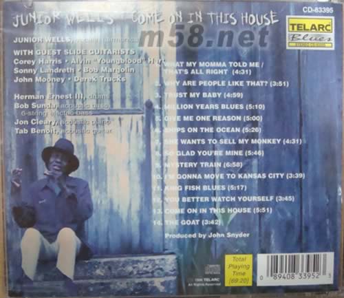 Come on in This House Junior Wells with 請君進屋(m58.net) 草根性與電化藍調結合顛峰代表作 請君進屋是他在Telarc唱片發行的第三張專輯,與前二張作品不同的是威爾斯意將芝加哥電化藍調回歸於曼菲斯內地草根傳統的企圖更加明顯,而其結果甚至於超過前二張作品。從簡化編曲、強調器樂原音甚至模擬“Sonny & Browinie”式單純的口琴加吉他伴唱帶給聆聽者的反樸歸真,道地的藍調之美。14首歌曲,優的不能再優。朱尼爾˙威爾斯的口琴搭配四位樂手自信卻不狂放的熱演。外表是搖滾的,內裡全是藍調信息。“Derek Trucks”的滑奏吉他辛辣彪悍叫人聽之瞠目結舌。曲目經口琴,雙滑奏吉他和碎拍鋼琴( Shnffle )氣息連通的結果,即使多有solo仍是火熱地聚焦在威爾斯冷漠的嗓音之下,好不精彩。曲3、4慢板中仍表現藍調搖滾蒂固的驅動力。曲5之“Sonny Landreth”再次讓我們見識他犀利非凡的鋼弦吉他滑奏技巧,電吉他則展現極佳的迷幻效果。另外曲11、13“Delta Blues”式的悠遠凄美訴盡了藍調之所以天生背負悲情性格最關鍵的理由所在。無庸置疑「請君進屋」是朱尼爾˙威爾斯的顛峰之作。