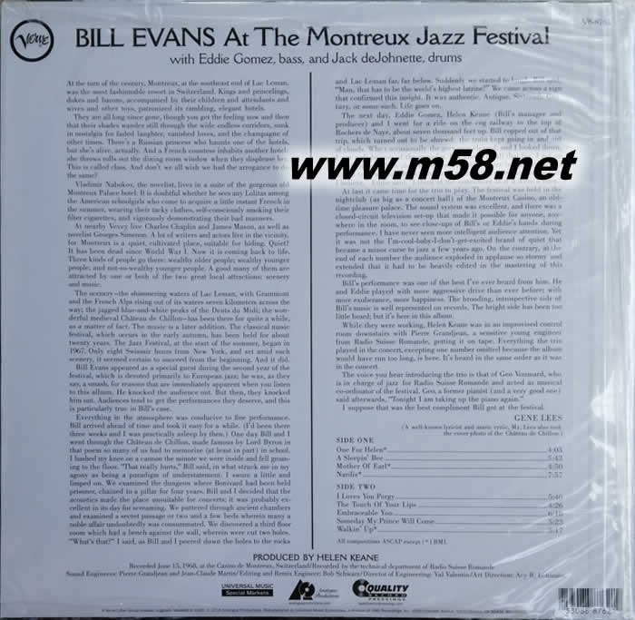 蒙特爾爵士音樂節現場 AT THE MONTREUX JAZZ FESTIVAL 黑膠(m58.net) BILL EVANS 鋼琴 EDDIE GOMEZ 貝斯 JACK JEJOHNETTE 鼓 1929年8月16曰生于美國新澤西州的普蘭菲爾德。比爾.伊文思從小受過良好的鋼琴教育,進入美國西南部的路易斯安那大學后.曾與曼德爾·洛和雷德·米切爾一起從事音樂活動。大學畢業后.比爾.伊文思應征人伍。1956年首次在紐約舞臺上與托尼·斯科特一起搞出,同年錄制了自己的首張唱片《爵士樂新概念》。 1957年,他與喬洽.拉富爾、查理·明各斯的合作.對曰后的發展產生了積極的影響。1958年,比爾·伊文思加盟著名的邁爾斯·戴維斯六重奏樂隊.并全身心地投入到與邁爾斯,戴維斯樂隊的合作中。《綠中的藍》和《德比的華爾茲》都是他這一時期演奏的經典樂曲并成為排行榜上的熱門曲。評論界曾毫不夸張地說:“他對爵士樂發展的貢獻在某種程度上就是建立起未來爵士樂鋼琴演奏家的標準。”1959年,比爾.伊文思開始指揮自己的三重奏小組,他們相映成趣的演奏.對后來的音樂家具有極 其深遠的影響。1962年,伊文思與查克.伊富瑞合作錄制了一張經典唱片。此后,又為多家唱片公司錄制了許多優秀作品,其中為河岸唱片公司、神韻唱片公司、范泰西唱片公司和華納唱片公司錄制的專輯最為著名。1980年9月l5曰,伊文思在紐約州紐約市去世,年僅59歲。