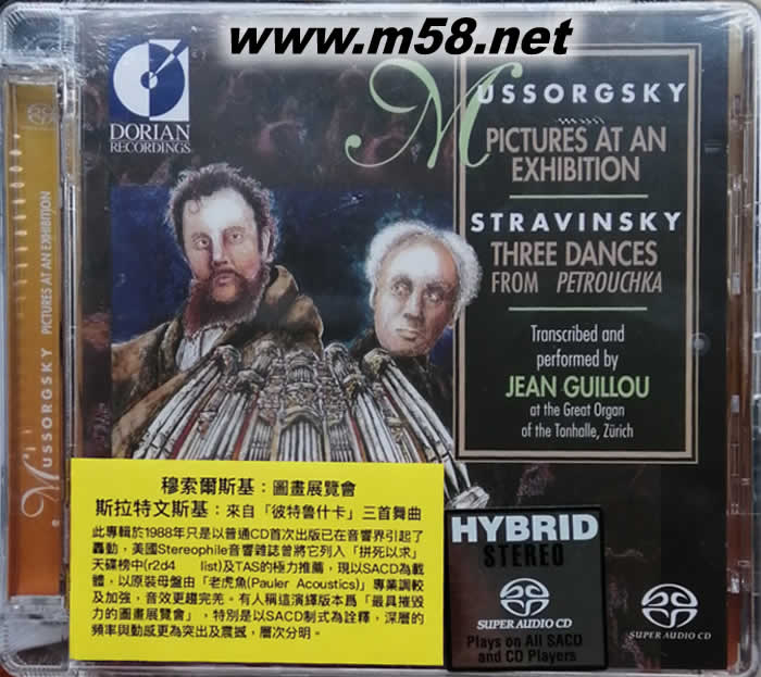 穆索爾斯基:圖畫展覽會 Pictures at an Exhibition 管風琴 SACD(m58.net) Jean Guillou (organ) 斯拉特文斯基:來自"彼特魯什卡"三首舞曲 Mussorgsky: Pictures at an Exhibition、 Stravinsky: Three Dances From Petrouchka 1. 此專輯於1988年只是以普通CD首次出版已在音響界引起了轟動,美國Stereophile音響雜誌曾將它列入“拼死以求”天碟榜中(r2d4 list)及TAS的極力推薦,這次以SACD為載體,以原裝母盤由「老虎魚」專業調較及加強,音效更趨完羌。 2. 專輯內兩位俄羅斯作曲家作品表現形式和其他同曲目的錄音版本有所不同,兩部作品都被改編為管風琴獨奏,欣 賞角度與效果和原作大異其趣。 3. 法國著名管風琴大師讓•古洛(Jean Guillou)的演奏保留了原作的精髓神韻,又將管風琴這“樂器帝王”的獨有音響 特性和宏偉的氣勢全面發揮出來,對於已經很熟悉這兩部作品的樂迷具有無比的吸引力,同時亦可從音樂欣賞角度 作出比較。 4. 改編后的《圖畫展覽會》曲式結構清新細致,管風琴奏出的樂音線條清晰凸顯,在演繹著名的《基輔大門(The Great Gate at Kiev)》樂章時,管風琴如咆哮般的沉穩音響震撼人心,有地動山搖, 氣勢磅礡的感覺,能量之強彷如能將聽音室即將摧塌,有人稱這演繹版本為“最具摧毀力的圖畫展覽會”,特別是以SACD制式為詮釋,深層的頻率與動感更為突出及震撼。 5. 來自"彼特魯什卡"三首舞曲輕快自然,節奏徐疾有致,音色圓潤明亮,層次分明。 Mussorgsky: Pictures at an Exhibition、Stravinsky: Three Dances From Petrouchka