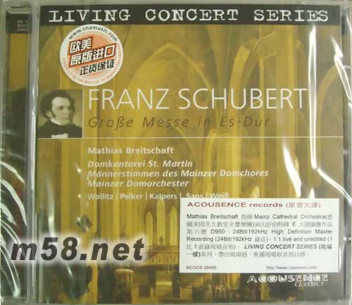 SCHUBERT: MASS IN E FLAT MAJOR, D950 原音天碟(m58.net) Katharina Wollitz, sopran Gudrun Pelker, Alt Johannes Kalpers, Tenor Daniel Sans, Tenor Hans-Otto Weiβ, Bss 1:1 LIVE AND UNEDITED ACOUSENCE records (原音天碟)… the acoustic experience 2004年成立,德國迅速走紅,錄音理念以發燒音效配上感動聽眾之樂章為主。當中LIVING CONCERT SERIES (現場一樣系列)是其最出眾作品系列,帶出現場感,重播現場原音為目標。24Bit/192kHz High Definition Master Recording (24Bit/192kHz 錄音)。