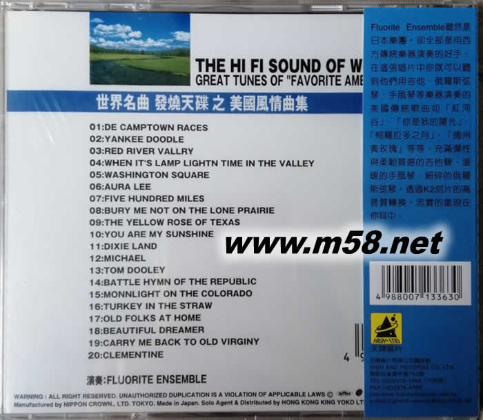 世界名曲發燒天碟之美國風情曲集(日本版)(m58.net) 【美國風情曲集】由5位日本樂手組成的團體,樂器有木吉他、電吉他、曼陀林、手風琴、俄國弦琴等。平易近人的樂聲牢牢牽住聽者的心緒,叫人不由自主的陷入美聲的漩渦中。本作品背景特別寧靜,應是K2 技術的功勞。