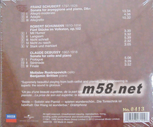 Schubert/Schumann/Debussy 24K金 限量版(m58.net) 大提琴家 Rostropovich 羅斯特羅波維奇 聯(lián)同Britten 布列頓爵士,演奏 舒伯特,舒曼等優(yōu)美樂(lè)章 24 Bit X 24K Gold X 日本版 全球限量盤(pán)1000件附珍貴限量編碼.