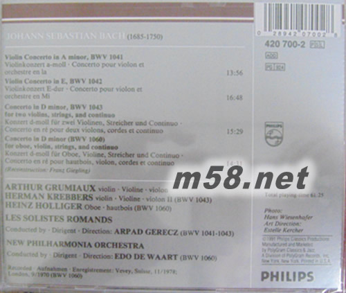 雙小提琴協奏曲Bach: Violin Concertos, Double Concertos PHILPS老版(m58.net) 哈:小提琴協奏曲、雙小提琴協奏曲【1CD】 Bach: Violin Concertos, Double Concertos 葛魯米歐、克雷伯斯, 小提琴 / 霍利格, 雙簧管 / Arthur Grumiaux, Hermann Krebbers, Violins / Heinz Holliger, Oboe / Les Solistes Romandes
