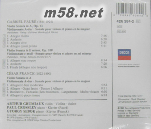 Gabriel Fauré (1845 - 1924) Sonata for Violin and Piano No.1 in A, Op.13 [1] 1. Allegro molto [7:22] [2] 2. Andante [6:53] [3] 3. Allegro vivo [3:48] [4] 4. Allegro quasi presto [5:16] Sonata for Violin and Piano No.2 in E minor, Op.108 [5] 1. Allegro non troppo [8:23] [6] 2. Andante [7:24] [7] 3. Finale (Allegro non troppo) [6:12] Arthur Grumiaux, Paul Crossley César Franck (1822 - 1890) Sonata for Violin and Piano in A [8] 1. Allegretto ben moderato [6:00] [9] 2. Allegro- Quasi lento- Tempo 1 (Allegro) [8:14] [10] 3. Recitativo - Fantasia (Ben moderato - Largamente - Molto vivace) [6:51] [11] 4. Allegretto poco mosso [6:21] Arthur Grumiaux, György Sebök