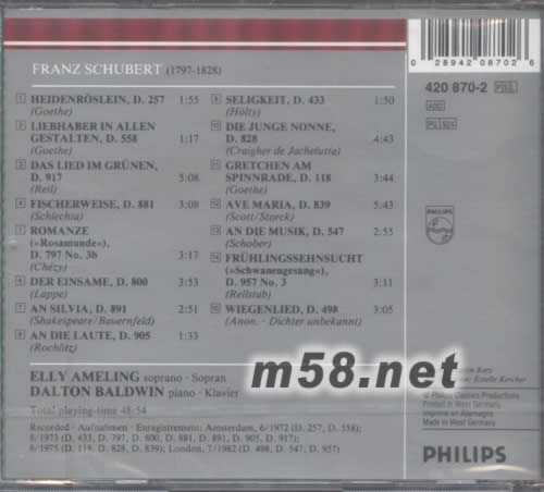 Heidenröslein, D. 257 (Op.3/3) 01:55 Liebhaber in allen Gestalten, D.558 01:17 Das Lied im Grünen, D.917 05:06 Fischerweise, D.881 03:08 Romance from Rosamunde, D.797 No.3b : Der Vollmond strahlt 03:17 Der Einsame, D.800 03:50 An Sylvia, D.891 (Op.106/4) 02:48 An die Laute, D. 905 (Op.81/2) 01:33 Seligkeit, D. 433 01:47 Die junge Nonne, D.828 04:43 Gretchen am Spinnrade, D.118 03:43 Ave Maria, "Ellens Gesang III", D839 05:41 An die Musik, D.547 (Op.88/4) 02:53 Frühlingssehnsucht, D.957 No.5 from Schwanengesang 03:09 Wiegenlied, D.498