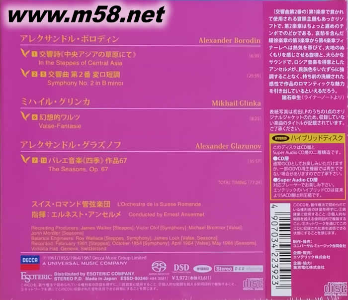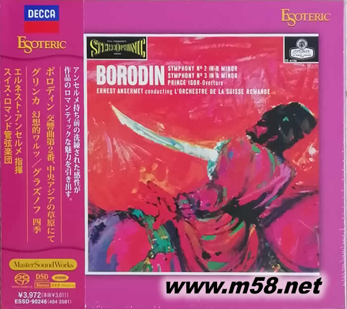 BORODIN 鮑羅丁 第二交響曲 安塞美指揮 SACD 日本限量版(m58.net) 樂團:瑞士羅曼德管弦樂團 ( L’Orchestre de la Suisse Romande ) 指揮:安塞美 ( Conducted by Ernest Ansermet ) 史上最佳古典音樂錄音之一,音樂與演奏變化萬千,錄音與指揮將原本已是多彩多姿的音樂發揮到了極致,其它曲目:格林卡:幻想圓舞曲;格拉祖諾夫:芭蕾音樂《四季》。日本壓制,全球限量發行。