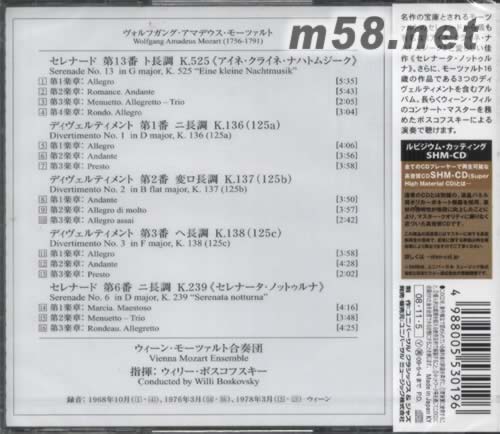 莫扎特 小夜曲 K525 嬉游曲 K138(SHM-CD 日本版)專輯背面圖片