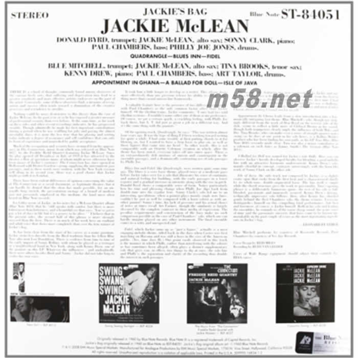 Jackie McLean - Jackie s Bag 杰姬的袋子 限量版 180g 45RPM LP 黑膠(m58.net) 藍調(diào)公司(Blue Note)重新發(fā)行的五張聲學(xué)唱片帶給我們更接近硬波普風(fēng)格的音樂。每個音符都清新簡潔,創(chuàng)造出無以倫比的靜謐氛圍。作為這些團隊的主打人員有著多么完美的合作。建議各位將聲音調(diào)高,因為他們的音樂中蘊涵了無限的能量和引力,能讓你瘋狂起來。簡直是不可思議!有一點小小的警告:一旦你開始播放這些藍調(diào)音樂錄音你就會被它深深吸引。