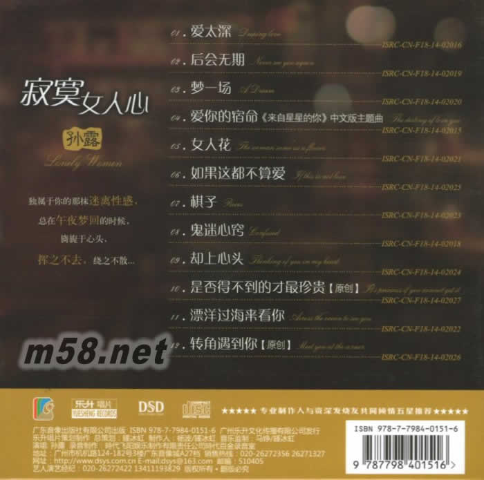 價(jià)格為估,以實(shí)到貨為準(zhǔn)! 寂寞女人心(m58.net) 《 孫露寂寞女人心》年度屏息以待的歌聲——孫露完美唱腔實(shí)力咋現(xiàn)“靈魂磁性歌聲,曲編演奏俱佳” 穿透靈魂的磁性女聲 撫慰情殤「靈魂女聲」---絕對是HIFI的“第一誘惑” 是那種發(fā)自靈魂最深處的本能誘惑!每一首歌充滿了神奇的誘惑魅力,曲風(fēng)旋律特色鮮明,令人屏息的純凈完美,展現(xiàn)來自孫露的內(nèi)心表白,讓你無從 抗拒的魅力女聲,每一把讓人為之動容的動人歌喉,令人無法抗拒的磁性女聲,相信即便是初次傾聽,也難以抵御它的聲色蠱惑,絕對能輕而易舉地俘獲每一位聆聽的心靈!歌聲在我們耳際飄過,那久蓄的情感就會激活我們的心靈,它瞬間打開我們記憶的閘門,帶領(lǐng)我們穿越時(shí)空的隧道,喚醒心底最久遠(yuǎn)的記憶…… ★專輯選曲制作首首選精敲細(xì)磨 量身打造 神曲再現(xiàn)集聆聽與收藏價(jià)值于一體的發(fā)燒天碟。