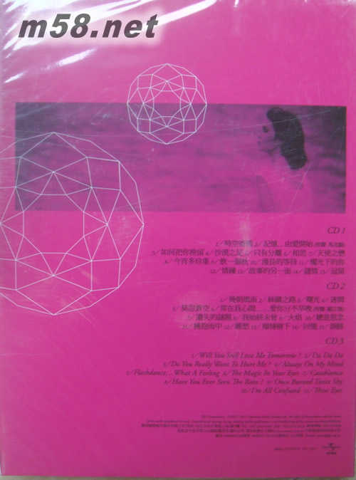 DISK 1 CD 1. 時空寄情 2. 記憶…由愛開始(男聲: 馬兆駿) 3. 如何把你挽留 4. 沙漠之足 5. 只有分離 6. 相思 7. 天使之戀 8. 今宵多珍重 9. 飲一個秋 10. 漫長的等待 11. 燭光下的你 12. 情鐘 13. 故事的另一面 14. 謎情 15. 逗留 DISK 2 CD 1. 幾朝風雨 2. 絲綢之路 3. 曙光 4. 迷惘 5. 莫怨蒼空 6. 常在我心間……愛你分不早晚 (男聲: 關正杰) 7. 遺失的謎題(詞/曲: 陳彼得) 8. 我始終未曾 9. 火焰 10. 總是思念 11. 擁抱雨中 12. 離愁 13. 榴槤樹下 14. 回憶 15. 淚跡 DISK 3 CD 1. Will You Still Love Me Tomorrow ? 2. Da Da Da 3. Do You Really Want To Hurt Me? 4. Always On My Mind 5. Flashdance…What A Feeling 6. The Magic In Your Eyes 7. Casablanca 8. Have You Ever Seen The Rain ? 9. Once Burned Twice Shy 10. I`m All Confused 11. These Eyes