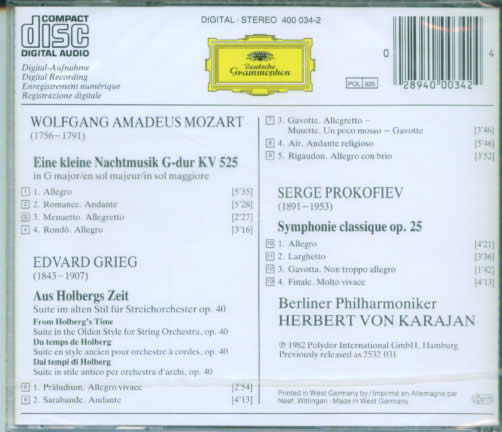 1. Mozart : Serenade in G, K.525 ��Eine kleine Nachtmusik�� - 1. Allegro 2. Mozart : Serenade in G, K.525 ��Eine kleine Nachtmusik�� - 2. Romance (Andante) 3. Mozart : Serenade in G, K.525 ��Eine kleine Nachtmusik�� - 3. Menuetto (Allegretto) 4. Mozart : Serenade in G, K.525 ��Eine kleine Nachtmusik�� - 4. Rondo (Allegro) 5. Grieg : Holberg Suite, Op.40 - 1. Praludium (Allegro vivace) 6. Grieg : Holberg Suite, Op.40 - 2. Sarabande (Andante) 7. Grieg : Holberg Suite, Op.40 - 3. Gavotte (Allegretto) - Musette (poco piu mosso) - Gavotte 8. Grieg : Holberg Suite, Op.40 - 4. Air (Andante religioso) 9. Grieg : Holberg Suite, Op.40 - 5. Rigaudon (Allegro con brio) 10. Prokofiev : Symphony No.1 in D, Op.25 ��Classical Symphony�� - 1. Allegro 11. Prokofiev : Symphony No.1 in D, Op.25 ��Classical Symphony�� - 2. Larghetto 12. Prokofiev : Symphony No.1 in D, Op.25 ��Classical Symphony�� - 3. Gavotta (Non troppo allegro) 13. Prokofiev : Symphony No.1 in D, Op.25 ��Classical Symphony�� - 4. Finale (Vivace)