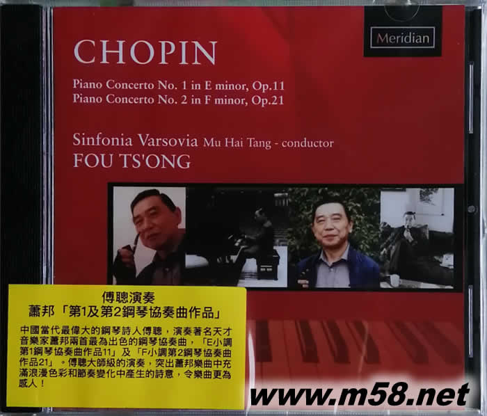 CHOPIN 肖邦1-2鋼琴協奏曲作品(m58.net) 1934年出生於上海,父親傅雷是近代著名文學家,也是研究法國名作家羅曼羅蘭的專家,傅聰的幼年教育即由其父啟蒙。九歲跟隨馬力歐‧巴契(Mario Paci)學琴,1952年與上海工部局交響樂團演奏貝多芬鋼琴協奏曲「皇帝」,深獲好評。次年榮獲「布加勒斯特國際音樂大賽」鋼琴第三名,旋即隨「藝術訪問團」前往波蘭、東德與蘇聯等國訪問。同時受邀參加1955年在華沙舉辦的第五屆蕭邦鋼琴大賽,榮獲第三名以及最佳馬厝卡演奏獎,當屆第一名是波蘭籍的哈拉塞維契,第二名則是阿胥肯納吉。之后進入華沙音樂院專攻鋼琴,1956年學成返回北京,1958年移居倫敦且展開他輝煌的演奏生涯。他的演奏溫厚而富人性,并堅守自身文化根源,是華人鋼琴家之中最受人尊敬的偉大音樂家。 本輯於1989年錄於波蘭波哥士(Bydgoszcz)的愛樂廳,在優異的錄音之下襯托出大師隨心所欲的琴韻,無礙的技巧與巧妙的彈性速度,可謂蓋冠群倫的精采演奏。 傅聰/鋼琴 湯沐海指揮瓦索維亞交響樂團Sinfonia Varsovia 錄音:1989年,波蘭