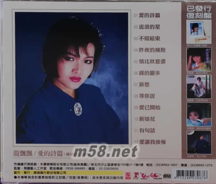 原聲系列 愛的詩篇 限量版(m58.net) 龍腔雅韻的歌聲 有你我共同的聽歌回憶 飄逸灑脫的嗓音 是市場公認的暢銷歌后 飄洋過海的傳奇 狂掃全球華人地區歌迷 龍飄飄 愛的詩篇專輯 發燒音質再造話題 每款限量500張