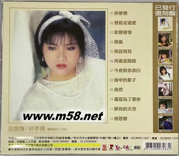 碎夢里 原色系列(m58.net) 留下樸實不華的聲音在腦海中飛揚 品嘗流行音樂不同風味的精彩 龍飄飄橫掃臺灣、東南亞最好的作品集 華語世界最具本土代表性的暢銷女歌手
