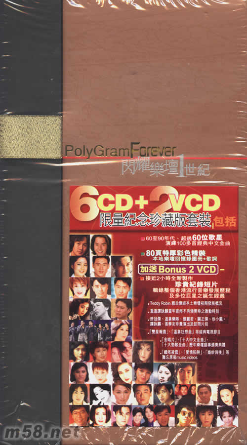 價格為估,以實到貨為準! 閃耀樂壇1世紀(m58.net) 6CD+2VCD 限量紀念珍藏版套裝 包括 60至90年代,超過60位歌星 演繹100多首經典中文金曲 80頁特厚彩色精裝 本地樂壇回憶錄圖冊+歌詞 加送BONUS 2VCD 接近2小時全新制作 珍貴紀錄短片 輯錄整個香港流行音樂發展歷程,及多位巨星之誕生經過 TEDDY ROBIN親自憶述本地樂壇初期發展概況 重溫譚詠麟當年定宣布不再領獎時之激動時刻 許冠杰,溫拿樂隊,鄧麗君,關正杰, 小鳳,譚詠麟,張學友珍貴演出及訪問片段 [雙星報喜],[溫拿狂想曲]等經典電視節目 [金唱片],[十大中文金曲],[十大勁歌金曲]歷年樂壇盛世頒獎禮 [鐵塔凌文],[愛情陷阱],[婚后背后]等難忘原裝MUSIC VIDEOS