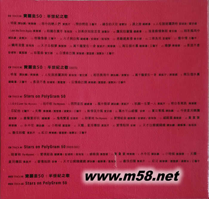 1.明星 (譚詠麟 / 陳慧嫻) 2. 雨中的戀人們 (黃凱芹) 3. 問你問我 (王馨平) 4.緣份的天空 (湯寶如) 5. 淚之旅 (鐘鎮濤) 6.人在旅途灑淚時 (區瑞強 / 雷安娜) 7.Love Me Once Again (陳慧嫻) 8.相識在童年 (區瑞強) 9.如果你知我苦衷 (湯寶如) 10.讓我坦蕩蕩 (鐘鎮濤) 11.我是癡情無限 (雷安娜) 12.相思風雨中 (譚詠麟 / 湯寶如) 13.堆積情感 (王馨平) 14.天才與白癡 (鐘鎮濤 / 彭健新 / 區瑞強) 15.患難建真情 (雷安娜) 16.二等良民 (彭健新) 17.雪中情 (王馨平) 18.鐵塔凌云 (區瑞強) 19.天才白癡夢 (露云娜) 20.萬千寵愛在一身 (黃凱芹 / 陳慧嫻) 21.兩忘煙水里 (鐘鎮濤 / 王馨平) 22.殘夢 (陳慧嫻) 23.長流不息 (彭健新 / 露云娜) 24.彩云曲 (雷安娜) 25.忘情森巴舞 (陳慧嫻/露云娜 /湯寶如/王馨平) II. 寶麗金 50 : 半世紀之歌 (Duets) 1.明星 (譚詠麟 /陳慧嫻 ) 2.人在旅途灑淚時 (區瑞強 / 雷安娜) 3.相思風雨中 (譚詠麟/湯寶如) 4.萬千寵愛在一身 (黃凱芹 / 陳慧嫻) 5.兩忘煙水里 (鐘鎮濤 / 王馨平) 6.長流不息 (彭健新 / 露云娜) 7.忘情森巴舞 (陳慧嫻 / 露云娜 / 湯寶如 / 王馨平) III. Stars on PolyGram 50 1.L-O-V-E Love (The Wynners) 2.玩嚇啦 (The Wynners) 3.閃閃星辰 (鐘鎮濤) 4.風中勁草 (譚詠麟 / 黃凱芹) 5.祇愿一生愛一人 (黃凱芹) 6.明日各東西 (陳慧嫻) 7.忘記他 (王馨平) 8.失戀 (陳慧嫻 / 露云娜 / 湯寶如 / 王馨平) 9.無情夜冷風 (雷安娜) 10.萬水千山縱橫 (音樂) 11.夏日寒風 (譚詠麟) 12.今夜星光燦爛 (露云娜) 13.最緊要好玩 (鐘鎮濤) 14.鬼馬雙星 (彭健新) 15.陪著她 (The Wynners) 16.愛情組曲 (鐘鎮濤 / 彭健新 / 區瑞強) 17.戚眼眉 (露云娜) 18.貪 貪 貪 (陳慧嫻) 19.水中花 (譚詠麟) 20.小時候 (露云娜) 21.天籟…星河傳說 (黃凱芹) 22.愛情陷阱 (音樂) 23.天才白癡錢錢錢 (譚詠麟 / 鐘鎮濤 / 區瑞強) 24.最佳拍檔 (黃凱芹) 25.紅日 (陳慧嫻 / 露云娜 / 湯寶如 / 王馨平) IV. Stars on PolyGram 50 (Radio Edit) 1. 陪著她 (The Wynners) 2.愛情組曲 (鐘鎮濤 / 彭健新 / 區瑞強) 3.戚眼眉 (露云娜) 4.貪 貪 貪 (陳慧嫻) 5.水中花 (譚詠麟) 6.小時候 (露云娜) 7.天籟…星河傳說 (黃凱芹) 8.愛情陷阱 (音樂) 9.天才白癡錢錢錢 (譚詠麟 / 鐘鎮濤 / 區瑞強) 10.最佳拍檔 (黃凱芹) 11. 紅日 (陳慧嫻 / 露云娜 /湯寶如 / 王馨平)