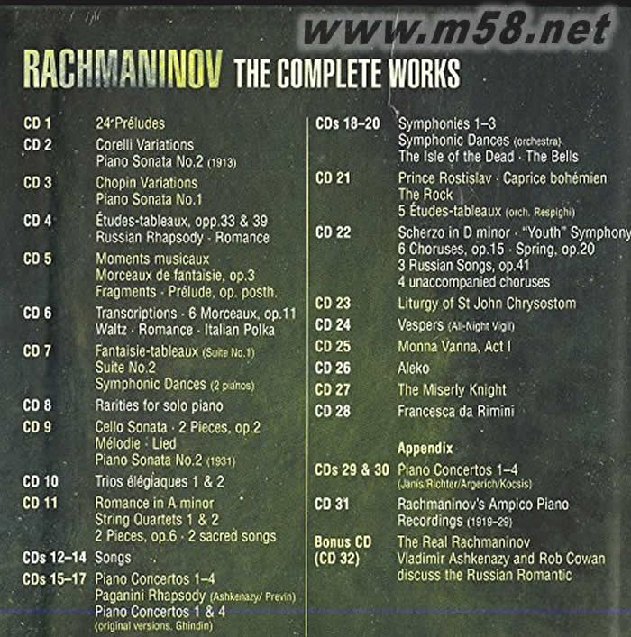 Rachmaninov : The Complete Works 拉赫曼尼諾夫:全集 (32CD大套裝)(m58.net) 本套專輯為拉赫曼尼諾夫作品的真正全集,從早年學生時期的習作,直到逝世前的作品錄音,首度集合在這套專輯當中,絕對是拉赫曼尼諾夫作品有史以來最完整且最具決定性的全集版本。其中還收錄了拉赫曼尼諾夫於1919-29年間,親自為再現(xiàn)鋼琴所作的紙捲錄音,包含許多小品與改編曲。珍貴的音樂文獻,超值低價限量發(fā)行,絕對值得典藏。受惠於DECCA眾多的杰出音樂家,這套專輯得以呈現(xiàn)最高水準的演出效果,其中流砥柱便是鋼琴家與指揮家阿胥肯納吉。他不僅出版過拉赫曼尼諾夫的主要鋼琴作品全集,更擔任拉赫曼尼諾夫協(xié)會的主席。一生以彈奏拉赫曼尼諾夫聞名,其所灌錄的拉赫曼尼諾夫作品,至今都還是最具有代表性的經(jīng)典。