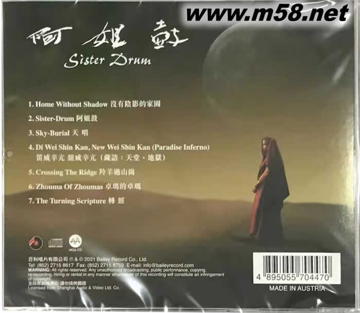 阿姐鼓 SISTER DRUM MQACD(m58.net) 沉實厚重的鼓聲震人心魄,朱哲琴極富個性充滿張力的歌聲卻平靜祥和,仿佛既沒有痛苦也沒有歡樂。成為國際唱片史上第一張全球發(fā)行的中文唱片。 這樂曲歌聲只能來自夢境般的西藏--那與世隔絕的神秘高原,宗教秩序井然信仰至高無上的凈土,俯瞰世界思索人生的制高點。西藏?zé)o疑是《阿姐鼓》主創(chuàng)人、詞曲作者何訓(xùn)田的神圣精神家園,數(shù)以百萬計的聽眾也同時聽到了高原的空曠與靜譎,空氣的純凈和清新,陽光的充足與明麗。 《阿姐鼓》講述了一個孤單的小姑娘失去了相依相伴的啞巴阿姐,但她不明白阿姐為什么離家,一直想到阿姐那么大,突然明白也許是夢想的幸福帶走了阿姐,也許還將帶走已長大成人的她。“阿姐鼓”這三個字并不富有詩意,甚至有點血淋淋的殘酷,原來“阿姐鼓”是人皮鼓,在西藏,只有圣潔的女人皮才配制鼓。“嗡嘛呢叭咪哞”這六個字是藏傳佛教中的六字真言,包含了世間的萬物。在西藏人的心目中,死并不可怕,它如同誕生新的生命一樣,是回歸大自然。作為輪回的一部分,生與死是平等的,只有幸福吉祥才最重要。“天邊傳來陣陣鼓聲/那是阿姐在對我說話”歌聲和鼓聲在平靜與激情對比中表達(dá)出面對高原嚴(yán)酷生存環(huán)境一切順乎自然的平和心態(tài)。 《阿姐鼓》的主唱朱哲琴是一位從來不愿在電視晚會上出現(xiàn)的流行歌手,她的歌唱具有深厚的美聲功底,并融入當(dāng)今聽眾心領(lǐng)神會的詮釋技法。細(xì)心的流行歌發(fā)燒友會在前些年朱哲琴用歌聲講述的《丹頂鶴的故事》中領(lǐng)略到她細(xì)膩婉轉(zhuǎn)震撼力很強的唱功。《阿姐鼓》的主創(chuàng)者何訓(xùn)田是上海音樂學(xué)院的教授,八歲就能譜曲寫歌,對西藏有著特殊的興趣,九零年曾獲“美國國際新音樂作曲家比賽杰出音樂成就大獎”,他獨創(chuàng)的R .D作曲法被世界公認(rèn)是劃時代的音樂改革。面對著充滿誘惑的現(xiàn)實生活,朱哲琴和何訓(xùn)田始終清醒自信,能孤獨而執(zhí)著地獨立于潮流和世俗之外,經(jīng)過了二十一個月的艱苦創(chuàng)作,制作出了這張“在世界范圍內(nèi)真正有影響的中國唱片”《阿姐鼓》。自從九五年五月十號海內(nèi)外同步發(fā)行以來一直暢銷不衰,是繼《黃孩子》之后又一張最不具備商業(yè)性卻在商業(yè)上取得巨大回報的CD。 《阿姐鼓》CD專輯是現(xiàn)在發(fā)燒友手中熱門的專輯之一,這張CD專輯在其發(fā)行之初便得到了許多發(fā)燒友及報刊的好評。它是一張真正來自中國,代表中國的專輯。它的創(chuàng)意、制作以西藏為出發(fā)點,頌揚天地的精神,有深刻的意境和獨有的特色。整張專輯時而高潮疊起,時而又婉如平湖,所以用來考驗器材的應(yīng)變力非常適會。 本專輯的錄音制作非常的Hi-Fi,每一首歌曲都有其獨到之處,低頻、人聲、合唱融為一體,百聽不厭。其中第2首《阿姐鼓》是整張專輯中突變性最大的一曲。此曲在約兩分鐘時,低頻驟出,份量十足,厚實而有力,很多小口徑音箱就此現(xiàn)形,低音單元拍邊,有的則更是出不來如此低的低音。此曲將本碟的制作水平展現(xiàn)得淋漓盡致;第六首《卓瑪?shù)淖楷敗穭t是低頻最豐富而最具彈性的一曲了。全曲婦終貫穿著豐富的低頻和人聲唱的“卓瑪”,播放時,完全沒有人聲和樂器混雜一團(tuán)的感覺,而是各就其位,活晰而有條理,集中展現(xiàn)了人們對崇高境界的問往和追求。此曲對組合的綜合再現(xiàn)力有很高的要求,如若控制不好,則會有拖泥帶水之感。老實說,要將此曲的低頻播好,動放的劫率至少應(yīng)在百瓦以上。否則,音量稍大,則會動力不足。類似的象本專輯中的第1首(沒有陰影的家園》,第4首《天堂•地獄》,第3首《天唱》,都有異曲同工之處。特別是第3風(fēng)《天唱》,唱法變換多樣,極富表現(xiàn)力的人聲,表達(dá)了一種虔誠而不含太多宗教色彩的情感,其中最出色的是此曲的合唱部分,仿佛給人以無限的光明和生死輪回、天人合一的感覺,音樂和歌聲更加開闊,仿若置身于天境之中。 當(dāng)然,除了這些,本輯中第5首《羚羊過山崗》是層次最分明,音場最寬的一曲。音樂一響,空曠寬廣的山野仿佛就展現(xiàn)在聽者面前,羚羊在其間奔向山崗,又越過山崗遠(yuǎn)去。其中有一段沒有歌詞,只聽唱者發(fā)出了一些聲音,十分清晰,表達(dá)了藝者認(rèn)為無法言喻的感覺,這一點對于音響器材的細(xì)微再現(xiàn)力是個考驗。此曲立體感之強,層次之分明,音場之寬實屬難得。第7首《轉(zhuǎn)經(jīng)》則是全輯中最爆棚的一曲,在低音電聲的長音下,出現(xiàn)了誦經(jīng)的合唱。女聲插入,帶著對生命的執(zhí)著,感情之濃烈讓人為之震撼。合唱的高潮出現(xiàn),氣勢磅礴,涵蓋一切,表達(dá)了一種對生死輪回、福禍因緣、永求吉祥如意的佛教思想,為本碟的精髓.