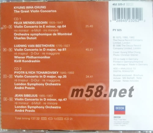偉大的小提琴協奏曲MENDELSSOHN/BEETHOVEN(古典愛好者必備)(m58.net) 鄭京和1948年3月26日出生在韓國的漢城,受父母喜愛音樂的影響,她從事了音樂演奏,在鄭京和求學的道路上她有幸得到本世紀的幾位名家的指點,她的琴藝突飛猛進。1967年,19歲的鄭京和與18歲的同門師弟祖克曼參加了著名的萊文垂特國際小提琴比賽,在這次比賽中她力克群雄,以優異的成績奪得第一名,祖克曼與其并列。當比賽結束,評委們在宣布獲獎者的名單時,早已緊張到極點的祖克曼在聽到自己獲得了本次比賽的第一名時不禁喜極而泣,而另一位第一名的獲得者鄭京和卻蹤影全無。當急壞了的人們在一個角落里找到她時,卻發現鄭京和早在那里進入了夢鄉。比賽結束后有評論家在報紙上這樣對鄭京和的演奏評論道:“在絕大多數十八九歲的青年演奏家還停留在展示技巧的時候,鄭京和卻早已善于將自己的人格魅力融入在了她所要演奏的音樂之中。”自這次比賽之后鄭京和的名聲大振,此后她巡演于全世界。鄭京和的演繹被一些音樂評論家認為“演奏有精確的節奏感,透明清純的音質,感情非常豐滿,美妙的抒情味能滲入作品的深處”。 小提琴協奏曲數量如此稀少,以至于頂尖的獨奏者不得不反復排練貝多芬《D大調小提琴協奏曲》、門德爾松《e小調小提琴協奏曲》、柴可夫斯基《D大調小提琴協奏曲》、勃拉姆斯《D大調小提琴協奏曲》四部作品,這使獨奏者在頻繁的演出生涯中要避免作品乏味變得很不容易。但是鄭京和在這點上顯然比大多數演奏者都成功,她曾說:“每一次的演出都能給我帶來一些新的靈感,如果不是這樣我將變得一無所有。” Decca這套雙CD已經將這位當代杰出女小提琴家在該公司灌錄的重要小提琴協奏曲一網打盡,共計收入貝多芬《D大調小提琴協奏曲》、門德爾松《e小調小提琴協奏曲》、柴可夫斯基《D大調小提琴協奏曲》、西貝柳斯《小提琴協奏曲》四部作品,擔任協奏的樂團和指揮家也都是一時之