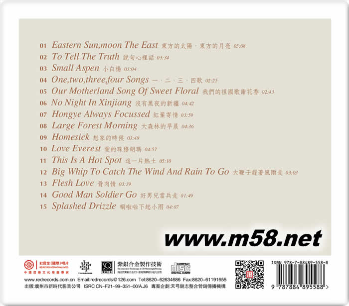 01.東方的太陽(yáng),東方的月亮 Eastern sun, moon of the East 02.說(shuō)句心里話 To tell the truth 03.小白楊 Small aspen 04.一、二、三、四歌 One, two, three, four songs 05.我們得祖國(guó)歌甜花香 Our motherland song of sweet floral 06.沒(méi)有黑夜的新疆 No night in Xinjiang 07.紅葉寄情 Hongye always focussed 08、大森林的早晨 Large forest morning 09.想家的時(shí)候 Homesick 10.愛(ài)的珠穆朗瑪 Love Everest 11.這一片熱土 This is a hot spot 12.大鞭子趕著風(fēng)雨走 Big whip to catch the wind and rain to go 13.骨肉情 Flesh love 14.好男兒當(dāng)兵走 Good man soldier go 15.唰啦啦下起小雨 Splashed drizzle