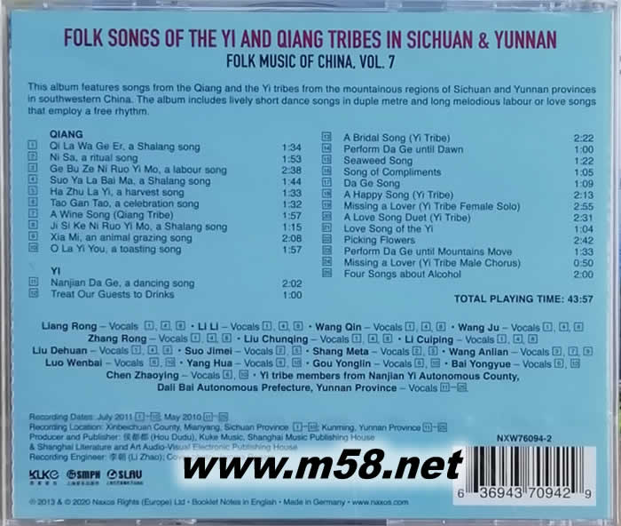 中國民歌集 (7) 四川 云南 彝族 羌族民歌 Folk Music of China, ol. 7 - Folk Songs of the Yi and Qiang Tribes in Sichuan and Yunnan(m58.net) 這張專輯的特色是來自中國西南部四川和云南山區的羌族和彝族的歌曲。這張專輯包括活潑的短小舞蹈歌曲,在兩米和悠揚的勞動或愛情歌曲,采用自由的節奏。
