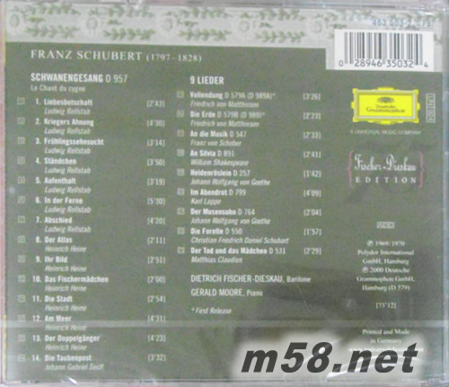 舒伯特:天鵝之歌&藝術(shù)歌曲集Schubert:Schwanengesang&Lieder(m58.net) 費(fèi)雪迪斯考與摩爾的合作關(guān)係,從五○年代初開始直到七○年代,長達(dá)廿余年,咸認(rèn)是廿世紀(jì)樂壇藝術(shù)歌曲演唱的最佳組合。尤其是摩爾於1968年自舞臺(tái)退休后,只在唱片錄音里固定與費(fèi)春迪斯考合作,在六○年代末到七○年代初DG所發(fā)行的一系列藝術(shù)歌曲唱片中,兩位最圓熟的藝術(shù)家,展現(xiàn)了最高超的音樂技藝。 這個(gè)《天鵝之歌》錄音,是在兩人進(jìn)行舒伯特463首男聲歌曲錄音的中途所完成的,時(shí)為1972年。此版早已經(jīng)是《天鵝之歌》的決定盤,為紀(jì)念費(fèi)雪迪斯考75歲壽辰而首度以中價(jià)位發(fā)行。除了14首《天鵝之歌》外,還收進(jìn)了同一時(shí)期錄製的<野玫瑰>、<鱒魚>、<死與少女>、<晚霞>等舒伯特最著的歌曲。