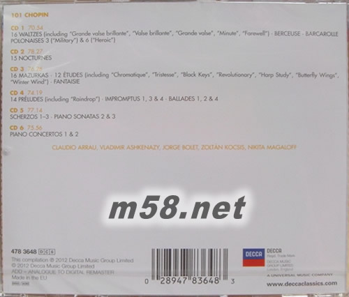101 Chopin 101肖邦殿堂大師精選套裝 101古典系列6CD套裝(m58.net) 2012全新101最愛系列 古典名廠牌DECCA超值6CD必備曲目,殿堂大師演繹 DECCA唱片官方試聽網址(片段): http://www.deccaclassics.com/cat/single?sort=newest_rec&PRODUCT_NR=4783648&SearchString=101&per_page=50&flow_per_page=50&presentation=flow&UNBUYABLE=1