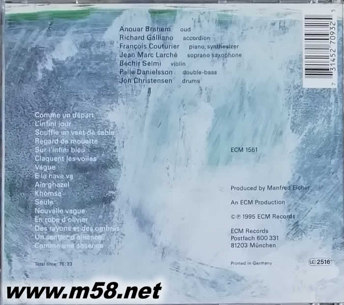 Khomsa (OUD烏德琴 阿拉伯琵琶 )(m58.net) 烏德琴(Oud)是流傳于中東和北非地區的一種撥弦樂器,狀如琵琶,聲音特性和演奏技法則更接近于吉它,因其音樂表現力驚人,加之歷史悠久,流傳廣泛,故此被譽為阿拉伯樂器之王。 來自北非突尼斯的Anouar Brahem是當代最杰出的烏德琴演奏家之一,曾師從突尼斯烏德琴泰斗Ali Sriti多年,長期浸淫阿拉伯民間音樂,從事烏德琴演奏已有20多年的歷史,足跡遍及中東及歐洲諸國。 本專輯是一張難得一聞的世界音樂唱片,由Anouar Brahem和他的三重奏成員共同完成。專輯吸收了各個地方的音樂元素,俄羅斯、阿塞拜疆、土庫曼斯坦的民間歌謠,印度、土耳其的民間音樂、吉普賽、弗拉門戈、西方的爵士樂與阿拉伯的音樂互相融合,既有沉重的哀傷又讓人陷入無限的冥想。