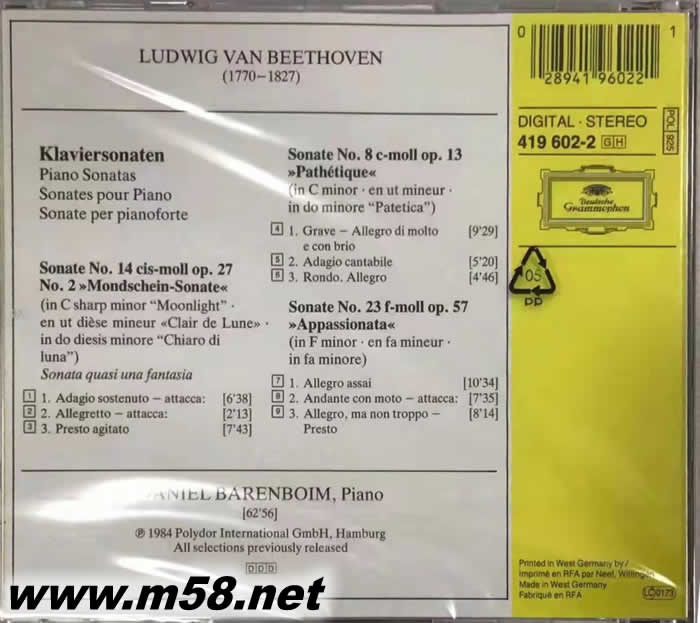 貝多芬:悲愴 、月光、熱情 鋼琴奏鳴曲 /巴倫博伊姆 - Daniel Barenboim - Beethoven: Piano Sonatas No. 8 & 14 & 23(m58.net) 這套《貝多芬:No. 8 & 14 & 23鋼琴奏鳴曲》由DG唱片公司發(fā)行于1987年,丹尼爾?巴倫博伊姆擔(dān)任鋼琴演奏,內(nèi)收錄了貝多芬的“悲愴”、“月光”、“熱情”鋼琴奏鳴曲。 c小調(diào)第八號鋼琴奏鳴曲《悲愴》,這是達(dá)到了貝多芬早期鋼琴奏鳴曲之頂峰的杰作,也是因其戲劇性的優(yōu)美旋律而為世人所熟悉的作品。本曲無論在內(nèi)容、旋律和結(jié)構(gòu)等諸多方面,都滲透著一種日耳曼民族特有的理性,這也是貝多芬等德國音樂家共有的特質(zhì)。本曲的演奏技巧并不太難,因此被演奏的機(jī)會(huì)也非常之多,更是許多鋼琴初學(xué)者愛不釋手的曲目。在貝多芬的鋼琴奏鳴曲中,《悲愴》是第一首由他本人親自寫上標(biāo)題的作品。關(guān)于悲愴這個(gè)辭匯,與貝多芬后半生那感人肺腑而又凄愴深刻的悲劇性生活還有相當(dāng)?shù)囊欢尉嚯x,因?yàn)檫@畢竟是他的早期作品。升c小調(diào)第十四號鋼琴奏鳴曲《月光》作于1801年。幾乎沒有一首名曲像這首奏鳴曲一樣,因“月光”這一俗稱而名滿天下、家喻戶曉。《月光》這一名稱據(jù)說是源于德國詩人路德維希?雷爾施塔布形容這首樂曲的第一樂章為“如在瑞士琉森湖那月光閃耀的湖面上,一只搖蕩的小舟一樣”。其實(shí),貝多芬自己曾提到過,本曲是“幻想曲式的奏鳴曲”。 f小調(diào)第二十三號鋼琴奏鳴曲《熱情》作于1804年,這首樂曲是貝多芬中期創(chuàng)作中的鋼琴杰作之一,而貝多芬自己則認(rèn)為本曲達(dá)到了他鋼琴奏鳴曲創(chuàng)作的巔峰。這一奏鳴曲是貝多芬所有作品中最富激情的一部,充滿斗志的“熱情”像巨浪一樣澎湃起伏。有關(guān)此曲,貝多芬:“去讀一下莎士比亞的名劇《暴風(fēng)雨》吧!”莎士比亞的名劇《暴風(fēng)雨》的主曾說過題表現(xiàn)的是人類的智慧和毅力必將戰(zhàn)勝大自然的力量,這一主題與本曲所表達(dá)出來的熱情奔放、具有英雄氣概的中心思想是完全吻合的。偉大的無產(chǎn)階級革命導(dǎo)師列寧十分贊賞這一奏鳴曲,他曾經(jīng)每天都要欣賞一次本曲,從中獲取無盡的力量。本曲的曲名《熱情》雖然是出版商取的,但十分貼切,所以一直延用到今天。 丹尼爾?巴倫博伊姆是一名西班牙的鋼琴家、指揮家,出生在布宜諾斯艾利斯,巴倫博伊姆受父母的影響,從小學(xué)習(xí)鋼琴,7歲就登臺(tái)演出,被譽(yù)為“鋼琴神童”。1952年全家移居以色列,1957年在美國卡內(nèi)基音樂廳首演。在彈奏鋼琴方面,他以對古典主義和浪漫主義作曲家作品多彩動(dòng)人的詮釋著稱。1962年開始專職指揮,1964-1975年擔(dān)任英國室內(nèi)樂團(tuán)指揮,1975-1989年轉(zhuǎn)任巴黎管弦樂隊(duì)指揮。1991年擔(dān)任芝加哥交響樂團(tuán)首席指揮,1992年任柏林國家歌劇院音樂指導(dǎo)。其在2009年擔(dān)任維也納新年音樂會(huì)的指揮。丹尼爾?巴倫博伊姆的指揮風(fēng)格嚴(yán)謹(jǐn)又不失奔放,擅長指揮德奧系作品,灑脫大方、干凈利落,善于抓住作品的整體結(jié)構(gòu),忠實(shí)地再現(xiàn)作曲家的創(chuàng)作意圖。丹尼爾?巴倫博伊姆對樂隊(duì)的音色以及聲部之間的平衡感覺敏銳,重視的音樂色彩變化和音樂表演的開創(chuàng)性。