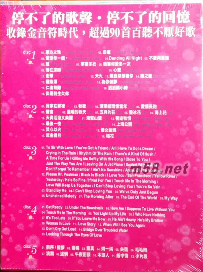 disc 1 01. 東方之珠[TVB電視劇"前路"主題曲] 02. 命運[TVB電視劇"火鳳凰"主題曲] 03. 愛定你一個[TVB電視劇"播音人"主題曲] 04. Dancing All Night 05. 不要再重逢 06. 盟[電影"盟"主題曲] 07. 寒夜冬衣 08. 我要你愛多一次 09. 情在深時[香港電臺廣播劇"情在深時"主題曲] 10. 心聲[TVB電視劇"仁者無敵"插曲] 11. 沖擊[TVB電視劇"沖擊"主題曲] 12. 天火 13. 難自禁想著你 14. 戀之歌(甄妮/傅聲) 15. 鱷魚潭[TVB電視劇"鱷魚潭"主題曲] 16. 為你做夢[TVB電視劇"播音人"插曲] 17. 仁者無敵[TVB電視劇"仁者無敵"主題曲] 18. 滔滔兩小時[香港電臺節目"滔滔兩小時"主題曲] 19. 似是前生欠你 disc 2 01. 我家在那里(國) 02. 秋歌(國) 03. 濛濛細雨憶當年(國) 04. 愛情長跑(國) 05. 誓言(國) 06. 溫暖的秋天(國) 07. 五月的花(國) 08. 魯冰花(國) 09. 海上花(國) 10. 天真活潑又美麗(國) 11. 海誓山盟(國) 12. 客途秋恨[電影"客途秋恨"主題曲](國) 13. 最后一夜[電影"金大班的最后一夜"主題曲](國) 14. 上海公園[電影"海峽兩岸"主題曲](國) 15. 焚心以火[電影"秦俑"主題曲](國) 16. 倩女幽魂[電影"倩女幽魂"主題曲](國) 17. 流金歲月[電影"流金歲月"主題曲](國) 18. 楊花[電影"靈幻新娘"主題曲](國) disc 3 01. To Sir With Love /You've Got A Friend /All I Have To Do Is Dream Crying In The Rain /Rhythm Of The Rain /There's A Kind Of Hush A Time For Us /Killing Me Softly With His Song /Close To You Just The Way You Are /Leaving On A Jet Plane /Sealed With A Kiss Don't Forget To Remember /Ain't No Sunshine /Angel Of The Morning 02. Please Mr.Postman /Black Is Black /I Love You /San Francisco Yellow River /Yesterday /He's So Fine /If Not For You Touch Me In The Morning /Love Will Keep Us Together I Can't Stop Loving You /You're So Vain 03. Stand By Me 04. I Can't Stop Loving You 05. We've Only Just Begun 06. Unchained Melody 07. The Morning After 08. The End Of The World 09. My Way disc 4 01. Get Ready 02. Under The Boardwalk 03. How Am I Suppose To Live Without You 04. Touch Me In The Morning 05. You Light Up My Life 06. I Who Have Nothing 07. It's Too Late 08. If You Leave Me Now 09. He Ain't Heavy He's My Brother 10. Woman In Love 11. Love Story 12. When Will I See You Again 13. Don't Cry Out Loud 14. Bridge Over Troubled Water 15. Looking Through The Eyes Of Love disc 5 01. 前序/憶夢 02. 春曉 03. 童真 04. 烘一烘 05. 失落 06. 毛毛雨 07. 浪潮 08. 迷惘 09. 午夜街頭 10. 木頭人 11. 紙中情 12. 小片段