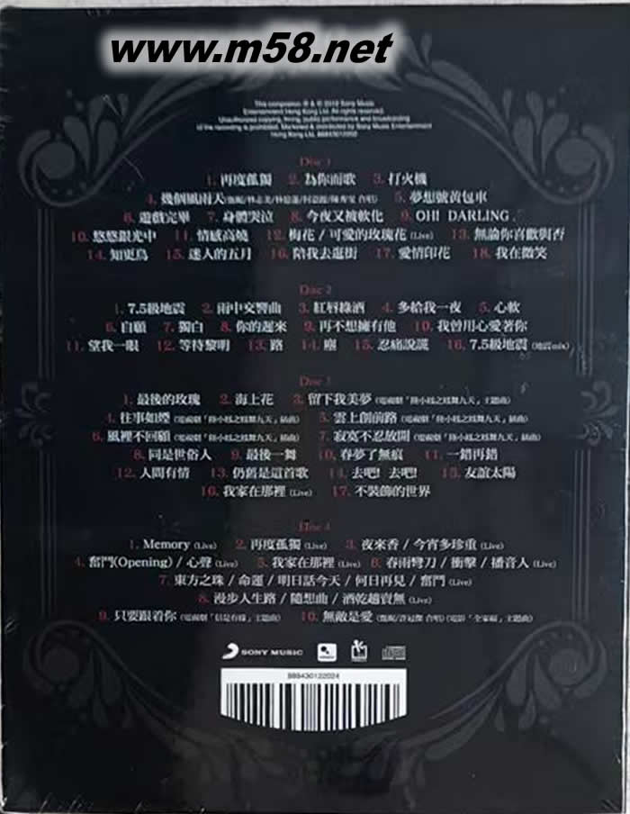 CD 1 01. 再度孤獨 02. 為你而歌 03. 打火機 04. 幾個風雨天(甄妮, 林志美, 林憶蓮, 何嘉麗, 陳秀雯合唱) 05. 夢想號黃包車 06. 游戲完畢 07. 身體哭泣 08. 今夜又被軟化 09. OH! DARLING 10. 悠悠銀光中 11. 情感高燒 12. 梅花 13. 可愛的玫瑰花 14. 無論你喜歡與否 15. 知更鳥 16. 迷人的五月 17. 陪我去逛街 18. 愛情印花 19. 我在微笑 CD 2 01. 7.5級地震 02. 雨中交響曲 03. 紅唇綠酒 04. 多給我一夜 05. 心軟 06. 自愿 07. 獨白 08. 你的遲來 09. 再不想擁有他 10. 我曾用心愛著你 11. 望我一眼 12. 等待黎明 13. 路 14. 塵 15. 忍痛說謊 16. 7.5級地震 (地震mix) CD 3 01. 最后的玫瑰 02. 海上花 03. 留下我美夢 04. 往事如煙 05. 云上創前路 06. 風里不回顧 07. 寂寞不忍放開 08. 同是世俗人 09. 最后一舞 10. 春夢了無痕 11. 一錯再錯 12. 人間有情 13. 仍舊是這首歌 14. 去吧! 去吧! 15. 友誼太陽 16. 我家在哪里 17. 不裝飾的世界 CD 4 01. Memory (Live) 02. 再度孤獨 (Live) 03. 夜來香,今宵多珍重 (Live) 04. 奮斗(Opening), 心聲 (Live) 05. 我家在那里 (Live) 06. 春雨彎刀,沖擊,播音人 (Live) 07. 東方之珠,命運,明日話今天,何日再見,奮斗 (Live) 08. 漫步人生路,隨想曲,酒干趟賣無 (Live) 09. 只要跟著你 (Live) 10. 無敵是愛