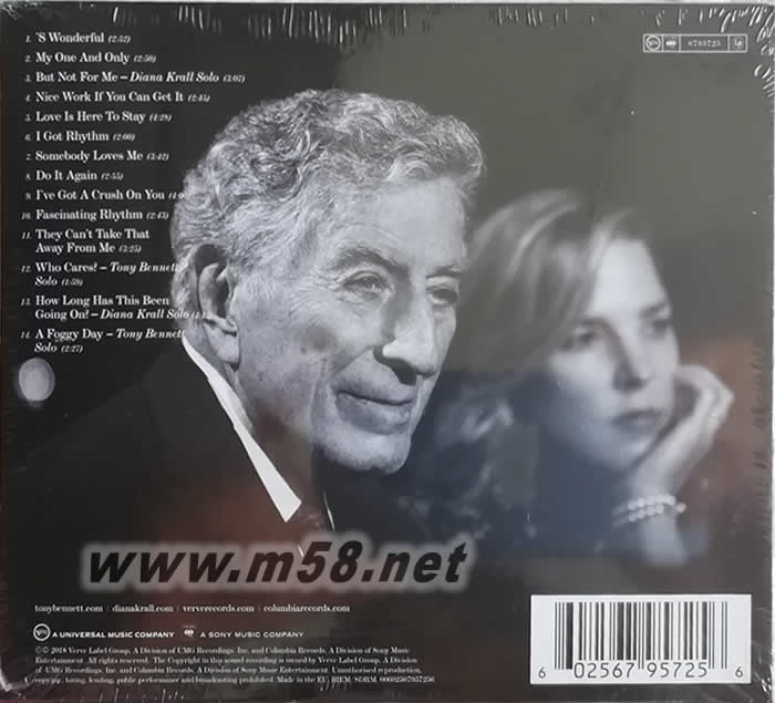 1. `S Wonderful 如此美好 一代舞王佛雷亞斯坦與奧斯卡影后奧黛麗赫本在1957年電影「甜姐兒」中的浪漫合唱曲 2. My One And Only 我唯一的愛人 1927年首演的百老匯音樂劇「甜姐兒」中的代表作,輕歌舞劇與劇場傳奇名曲 3. But Not For Me – Diana Krall Solo* 失落的我 蓋希文兄弟典型的情歌,艾拉費茲傑拉的版本為她贏得1959年葛萊美獎最佳女歌手演唱獎 4. Nice Work If You Can Get It 如果你做得到,那就太棒了 1992年東尼獎得獎音樂劇「Crazy For You」,2012年東尼獎10項提名同名的音樂劇歌曲 5. Love Is Here To Stay 愛,永遠常在 經典合唱曲,獲得1990年金球獎提名電影「當哈利碰上莎莉」中選用的歌曲 6. I Got Rhythm 節奏上身 入選美國電影學會的「百年百大電影歌曲」名單的經典傳唱不朽金曲 7. Somebody Loves Me 有人愛著我 建構20世紀娛樂產業的傳奇藝人平克勞斯貝,葛萊美獎終身成就獎佩姬李紛紛留下動人版本名曲 8. Do It Again 再來一次 來自法國科西嘉島的影歌雙棲女藝人艾琳波多尼曾在1922年為這首慢板性感歌曲增添挑逗風情 9. I`ve Got A Crush On You 我迷戀你 經典抒情金曲,電影「愛你在心眼難開」,「愛情三選一」中的選用歌曲 10. Fascinating Rhythm 迷人的節奏 東尼班奈特灌錄生平第一張唱片的演唱歌曲,音樂劇「Lady, Be Good!」中的著名合唱曲 11. They Can`t Take That Away From Me 他們不能帶走我對你的回憶 佛雷亞斯坦在歌舞片「隨我婆娑」中演唱的名曲,1989年奧斯卡最佳影片「雨人」中的歌曲 12. Who Cares? – Tony Bennett Solo 誰會在乎啊? 第一部榮獲普立茲戲劇獎的音樂劇「Of Thee I Sing」中演唱的名曲,佛雷亞斯坦與搖擺之王班尼古德曼曾合作的經典