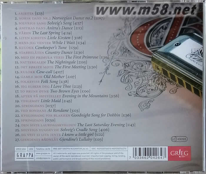醉人口琴美樂GRIEG ALBUM(m58.net) 口琴大師SIGMUND GROVEN演繹作曲家GRIEG的多首短篇作品,在樂章中滲透出那濃列的北歐情感,暖和的旋律與古典懷情融匯在一起,頂級(jí)錄制,深闊的場(chǎng)景令發(fā)燒友著迷。