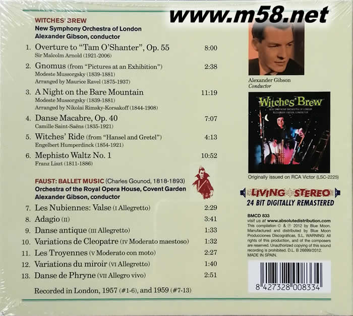 女巫佳釀 Witches’Brew(TAS專業推薦發燒名盤CD)(m58.net) 一樣由吉布森指揮,一樣在音效絕佳的Kingsway Hall錄音,也一樣由Kenneth Wilkinson威爾金森操刀。專輯「魔女佳釀」是名列TAS榜上的名盤,收錄了氣氛恐怖肅殺的曲目,也為后世的古典音樂合輯開了一個極佳的先例。本專輯仍然是標準的Wilkinson制作,錄音氣氛、氣勢、氣韻均佳,開闊磅礡音效讓人感動無比。