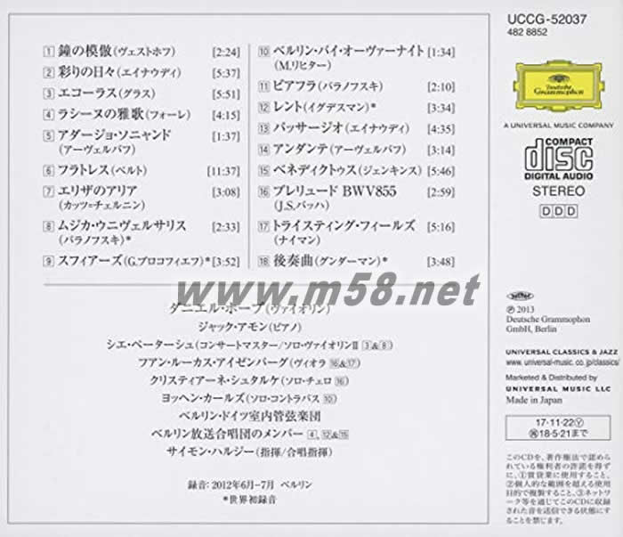 Spheres(星穹) SHMCD 日本版(m58.net) 用琴弦探尋宇宙中的玄秘之音 一張為21世紀而生的唱片,并一躍而至ITUNES古典音樂欄及古典唱片銷售排行榜榜首,獲利013年德國古典回聲大獎。 一張星穹專輯,搜羅了從17世紀到21世紀的作品,其中四首曲目是世界首度錄音。 小提琴家丹尼爾 霍普,他將過往與當下作曲家的作品并置 的有趣嘗試,都是他高度藝術的溝通技巧的證明。這位英國小提琴家總是隨時準備好云迎接新的挑戰,云挖掘并向世人展示那些被我們忽視的曲目
