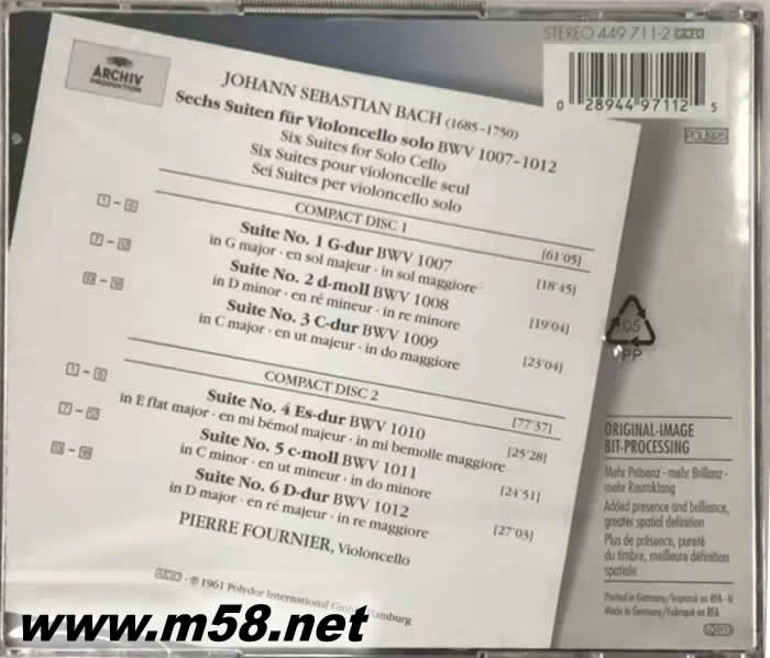 Bach 6 Suites FUR VIOLINCELLO SOLO 巴赫 大提琴組曲 2CD大禾花版(m58.net) 巴赫的6首獨奏大提琴組曲,BWV1007-1012,大約作于1717年的克滕宮廷。這一套組曲采用標準的古典組曲形式,由數種古典舞曲組成。當時克滕宮廷中有兩位古大提琴演奏家阿貝爾與李尼希克,巴赫以這兩位演奏家作為對象作成這套組曲。 這套組曲譜系巴赫的第二位妻子安娜?瑪格達琳娜抄錄,原譜沒有速度標記。現在這套組曲的速度標記有多種歷代著名大提琴演奏家所標標志,公認的版本是19世紀著名大提琴家貝爾卡所標,卡薩爾斯所標版本也極為重要。 Archiv公司這款再版錄音的演奏者皮埃爾?富尼埃(Pierre Fournier 1906-1986)是20世紀法國著名的大提琴家,以演奏風格高雅、情感浪漫著稱。富尼埃1906年出生于巴黎的一個中產階級家庭中,受家庭良好文化氛圍的影響與熏陶,富尼埃自幼便非常喜愛音樂,1937年至1939年,他一直擔任法國巴黎音樂師范學校的大提琴教授和室內樂教授。1941年至1949年在巴黎音樂學院擔任大提琴教授。1953年他被授予法國國家勛章,獲得崇高的榮譽。大師60年代的錄音,也是他最負盛名的一版。