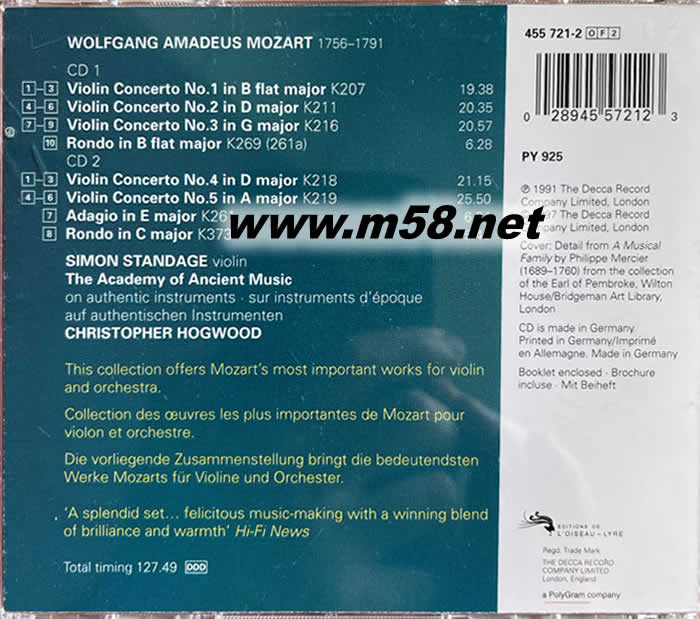 天堂鳥唱片 VIOLIN CONCERTOS 莫札特:小提琴協(xié)奏曲 五號(hào)專輯背面圖片
