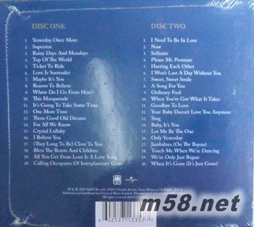 CD 1 01. Yesterday Once More 02. Superstar 03. Rainy Days And Mondays 04. Top Of The World 05.Ticket To Ride 06. Love Is Surrender 07. Maybe It's You 08. Reason To Believe 09. Where Do I Go From Here? 10. This Masquerade 11. It's Going To Take Some Time 12. One More Time 13. Those Good Old Dreams 14. For All We Know 15. Crystal Lullaby 16. I Believe You 17. (They Long To Be) Close To You 18. Bless The Beasts And Children 19. All You Get From Love Is A Love Song 20. Calling Occupants Of Interplanetary Craft CD 2 01. I Need To Be In Love 02. Now 03. Solitaire 04. Please Mr. Postman 05. Hurting Each Other 06. I Won't Last A Day Without You 07. Sweet, Sweet Smile 08. A Song For You 09. Ordinary Fool 10. When You've Got What It Takes 11. Goodbye To Love 12. Your Baby Doesn't Love You Anymore 13. Sing 14. Baby, It's You 15. Let Me Be The One 17. Jambalaya (On The Bayou) 18. Touch Me When We're Dancing 19. We've Only Just Begun 20. When It's Gone (It's Just Gone)