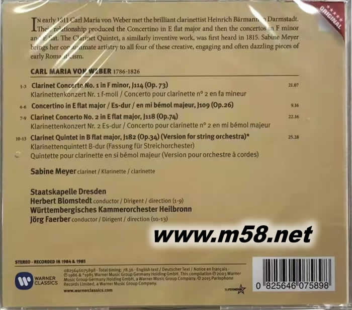 單簧管女皇 - WEBER 單簧管協奏曲集 韋伯單簧管協奏曲(m58.net) Sabine Meyer 可能是當今最好的單簧管演奏家。這些 Von Weber 作品的錄音非常適合展示她的才華。單簧管經典的激烈演奏. 邁耶因成為卡拉揚和柏林愛樂樂團破裂的催化劑而聲名鵲起。這位大師認為她的音調過于獨奏,無法與管樂隊融為一體,管弦樂隊對此表示反對,并爆發了對能力的尖刻,在卡拉揚去世前從未得到治愈。 看來他是對的。邁耶繼續擔任獨奏家,這場爭論已成為現成的跳板。但現在這張專輯和它對“偉大”的挑戰性聲明擺在我們面前,我們必須決定它在我們的感情中可能占據什么位置。 這些都是獨奏家和管弦樂隊完成的、高度優美的表演。出色的記錄,它們為當時流通的幾個舊版本提供了激烈的競爭。但是“偉大”?這似乎是一種令人不快的夸張。“偉大”對你我意味著什么? 我想說,主要是,以韋伯的旋律為主要考慮因素,單簧管必須是一個“歌手”,在樂句的呼吸和對花腔的敏銳敏感度方面模仿男高音或女高音,這不僅僅是精湛的技藝,而是一種表現樂器與生俱來的旋律的方式。請記住,Weber 和 Spohr 在他們那個時代是先驅和友好的競爭對手,因為他們發現了這種有點暗色調的樂器的資源,如果呼吸類型錯誤,它在中間音域聽起來要么是鼻音,要么在頂部發出吱吱聲。邁耶并沒有完全成功地擺脫這些危險。她似乎并沒有明顯地參與作曲家為她提供的冒險;盡管她非常能干地處理她的樂器,但她很酷。 對于這些標準,我發現與 Masur 一起掌管格萬德豪斯管弦樂團的 Sharon Kam 是一個更可取的讀物。但真正對這些作品“深入了解”的藝術家是迪特爾·克洛克。他的呼吸令人嘆為觀止,他無縫的旋律線條是單簧管演奏者所能達到的典范。不幸的是,他的管弦樂隊是二流的——但對于單簧管作為獨奏樂器的愛好者來說,這是一場真正的相投,因此是“偉大”的表演。因此,在做出承諾之前,先將這些替代品作為您的業務。您可能會驚訝于這種樂器的真正藝術性可以產生多大的差異!