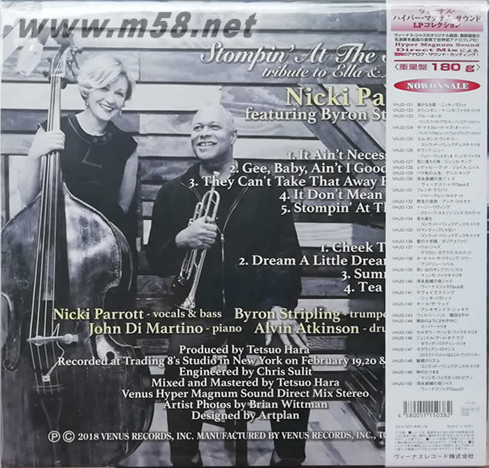 Stompin' At The Savoy - tribute to Ella and Louis 名曲對唱 獻給艾拉與路易斯 黑膠 日本版(m58.net) 百變歌姬妮基.派洛特再度推出向前輩致敬的專輯,重現艾拉.費茲潔拉與路易斯.阿姆斯壯的經典絕唱! Nicki Parrott - vocals & bass Byron Stripling - trumpet & vocals John Di Martino - piano Alvin Atkinson - drums Venus唱片的百變歌姬妮基.派洛特在推出一系列向前輩致敬的專輯之后,這回向爵士樂壇的天后艾拉.費茲潔拉(Ella Fitzgerald)與天王路易斯.阿姆斯壯(Louis Armstrong)兩人致敬。有著「爵士第一夫人」稱號的艾拉,歌聲純凈完美,擬聲(Scat)歌唱更是一絕。而以小號手起家的路易,不但曾組建自己的樂團,把爵士樂從紐奧良地區推廣成世界語言,后來更以渾厚沙啞的嗓音風靡全球。兩人年紀雖然差了17歲,但在1950年代共同錄製的《Ella and Louis》系列專輯,更是爵士樂永恆的經典。就算當時已經進入咆勃爵士樂(Bebop)的時期,路易還是堅持自己的搖擺(Swing)風格。這張專輯的標題曲就取自1920年代紐約哈林區盛極一時的Savoy大舞廳,從第一首就洋溢著濃濃的搖擺韻味,一路搖擺到最后一首。 放眼當今樂壇能吹小號,又能唱的樂手,大概只有拜倫.斯特里普林(Byron Stripling)了。1961年出生於亞特蘭大城的拜倫,不僅曾與眾多頂尖樂手共同演出過,最顯赫的資歷莫過於曾擔任貝西伯爵大樂團的小號領班,他還在音樂劇「書包嘴」(Satchmo,路易的外號)中擔綱演出路易,妮基邀請他來共同向天王天后致敬,絕對是不做第二人想。整張專輯以男女合唱的方式呈現,加上鋼琴名家約翰.迪.馬替農(John Di Martino)的浪漫伴奏下,重現艾拉與路易斯的經典絕唱。 Recorded at Trading 8's Studio in New York on February 19,20 & 21, 2018.