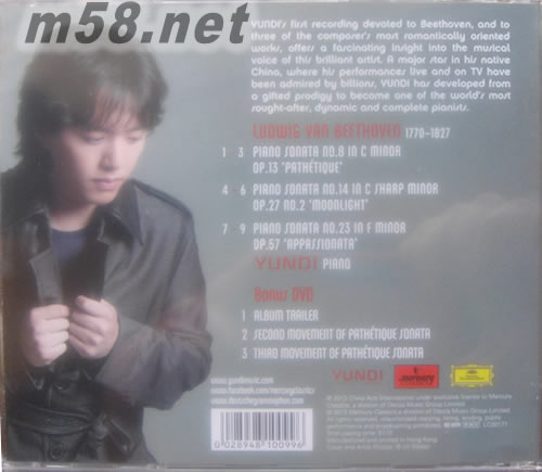 Beethoven : Pathetique&Moonlight&Appassionata貝多芬 特別版(m58.net) 李云迪十年音樂歷程,再次展現名家演繹風范 第八號鋼琴奏鳴曲《悲愴》沒有艱深的彈奏技巧,加上第二樂章如歌般淒美的主題旋律,讓它成為貝多芬早期鋼琴奏鳴曲中最著名、演奏率最高的一首。《悲愴》這個標題不是后人增補,而是貝多芬自己加上的,對這首奏鳴曲的氣質而言,是一個相當貼切的標題。其中有如管弦樂效果般暗潮洶涌的效果,對當時的鋼琴是很大的挑戰。 《月光》奏鳴曲創作於1801年,貝多芬把它題獻給自己的學生。據說,貝多芬對這個學生愛慕已久,因此,后人認為貝多芬把自己戀愛的心情全部寫在這部奏鳴曲里。「月光」的標題,據說來自德國詩人與樂評人雷爾斯塔伯聽到第一樂章后的形容:「就像月光閃耀著的瑞士琉森湖上,有一葉蕩漾的小舟。」《熱情》奏鳴曲創作於1804-06年間,因為氣勢雷霆萬鈞頭尾兩個樂章,因此出版商為它冠上「熱情」的標題。 2000年在蕭邦大賽奪冠之后,李云迪已經漸漸成長為一名成熟的音樂家。李云迪的演奏充滿了詩情,觸鍵細膩卻又能兼顧到音樂應該有的力度,樂曲架構清晰,是難得一見令人欣喜的全新錄音。
