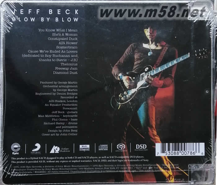 Blow By Blow 神乎其技 SACD(m58.net) Jeff Beck是搖滾樂歷史上最具影響力的吉他手之一。他對布魯斯搖滾、迷幻搖滾和重金屬樂的形成起著很大的推動作用。在六、七十年代搖滾樂早期的四位吉他巨人當中,Jeff Beck有著和Jimmy Page一樣的創(chuàng)新精神,有著和Eric Clapton一樣對音樂的鑒賞力,有著和Jimi Hendrix一樣的幻想,但他是四人當中在商業(yè)上最不成功的一個。以他為首的樂隊總是壽命短暫,沒有什么輝煌成績,但Beck的叛逆性的演奏風格,卻給人們留下了深刻的印象。