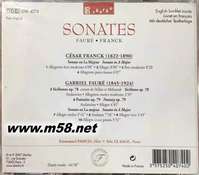 Faure/ Franck: Sonates 法朗克: 小提琴奏鳴曲(長笛改編版)(m58.net) Emmanuel Pahud 帕胡德, 長笛/ Eric le Sage, 鋼琴 介紹 :柏林愛樂長笛首席精彩之作; 曲韻迷人, 自成一格 法國原裝進(jìn)口,發(fā)燒級(jí)錄音