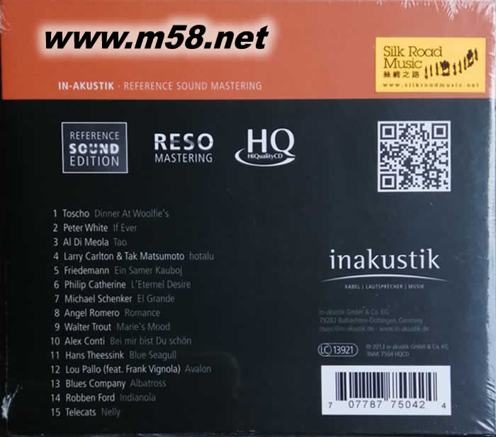 宏亮的結(jié)他聲 GREAT GUITAR TUNES HQCD(m58.net) 音源對(duì)比母盤(pán)制作(RESO Mastering – Reference Sound Mastering)是採(cǎi)用現(xiàn)今最高解像度技術(shù)使原母盤(pán)內(nèi)的音源效果得以改良和提升,清澈度更高,動(dòng)態(tài)范圍更寬,低頻更重更深,是音響發(fā)燒友夢(mèng)寐以求的音效。繼【宏亮的嗓音,第1及第2輯(Great Voices, Vol. I & II)】以嘹亮清澈的聲線演繹精彩樂(lè)曲為主題的專(zhuān)輯與及【流行經(jīng)典新風(fēng)釆(Great Cover Versions)】以多位來(lái)自歐美的出色唱作人,他們各自精心挑選了自己演繹最喜愛(ài)的[別人的歌]取得極度成功后,此種高新技術(shù)制作得到樂(lè)迷一致認(rèn)同和讚賞,你可從專(zhuān)輯內(nèi)的樂(lè)曲中鑑賞到每首歌的人聲和樂(lè)器聲更和暖和更具真實(shí)感,音色變得更晶瑩剔透,高音更清,中音更準(zhǔn),低音更重,音場(chǎng)更深更闊,動(dòng)態(tài)更寬更廣,但又來(lái)得自然,加上各個(gè)唱者皆擁有一副動(dòng)人的聲線,集合所有過(guò)人的優(yōu)點(diǎn),每首樂(lè)曲便成為天籟之聲。最新專(zhuān)輯【宏亮的結(jié)他聲調(diào) (Great Guitar Tunes)】便是秉承此系列的製作方向和元素,以具動(dòng)感、搖擺力、澎湃感的樂(lè)器「結(jié)他」為主題, 集合多位結(jié)他大師的名作[迪.美奧勒(Al Di Meola):道(Tao)]、[弗萊德曼.韋迪卡(Friedemann Witecka):薩默爾.考博揚(yáng)(Ein Samer Kauboj)]、[藍(lán)調(diào)公司(Blues Company):信天翁(Albatross)]、[邁克.申克爾(Michael Schenker):格蘭德人(El Grande)]、[魯賓.霍德(Robben Ford):印第安諾拉(Indianola)]、[托思祖(Toscho):於沃弗爾的晚餐(Dinner At Woolfie’s)]等, 當(dāng)細(xì)聽(tīng)這些樂(lè)曲時(shí),你便完全領(lǐng)略到這新制式確是音效完美之作,配以完全德國(guó)製造的DMM直刻母盤(pán)壓製的180克處女膠為載體的黑膠唱片為載體,塑造出一張主題明確、音效突出的鑑聽(tīng)必然之選。
